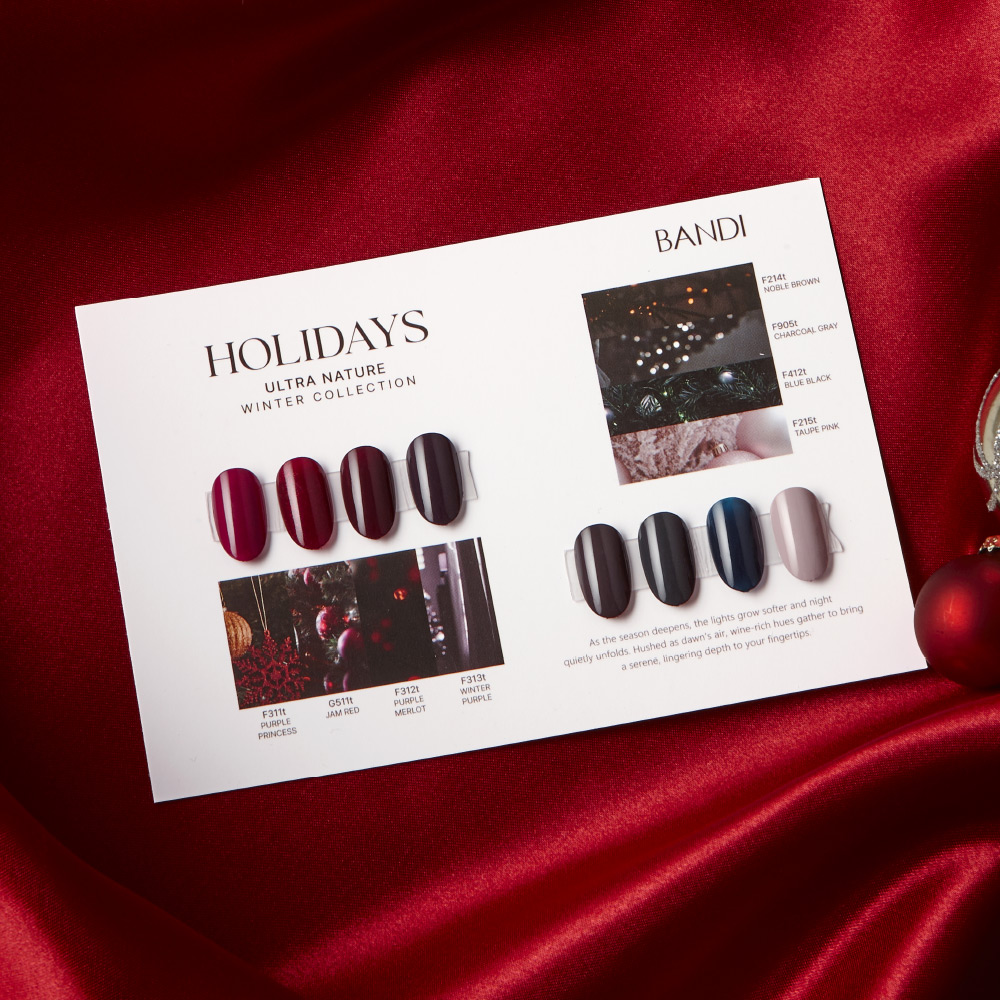 Встречайте лимитированную зимнюю коллекцию лаков для ногтей Holidays от BANDI В коллекции представлены глубокие и насыщенные цвета, которые напомнят вам о мерцании праздничных огней и безмятежной тишине зимней ночи. Каждый лак из коллекции Holidays — это история, рассказанная через оттенки. Мягкие и глубокие цвета создают неповторимую атмосферу умиротворения и очарования. Они станут идеальным дополнением к вашему зимнему образу и подчеркнут вашу индивидуальность F311t Purple Princess - оттенок символизирует зимние чудеса и волшебство, окутывающее всё вокруг сказочной атмосферой. G511t Jam Red – темно-красный, сияющий глиттер F312t Purple Merlot – глубокий винный, пьянящий оттенок. F313t Winter Purple – темный фиолетовый, загадочный оттенок F214t Noble Brown – насыщенный серо-коричневый цвет F905t Charcoal Gray –строгий темно-серый оттенок F412t Blue Black – контрастный и глубокий цвет F215t Taupe Pink – нежный розово-бежевый оттенок