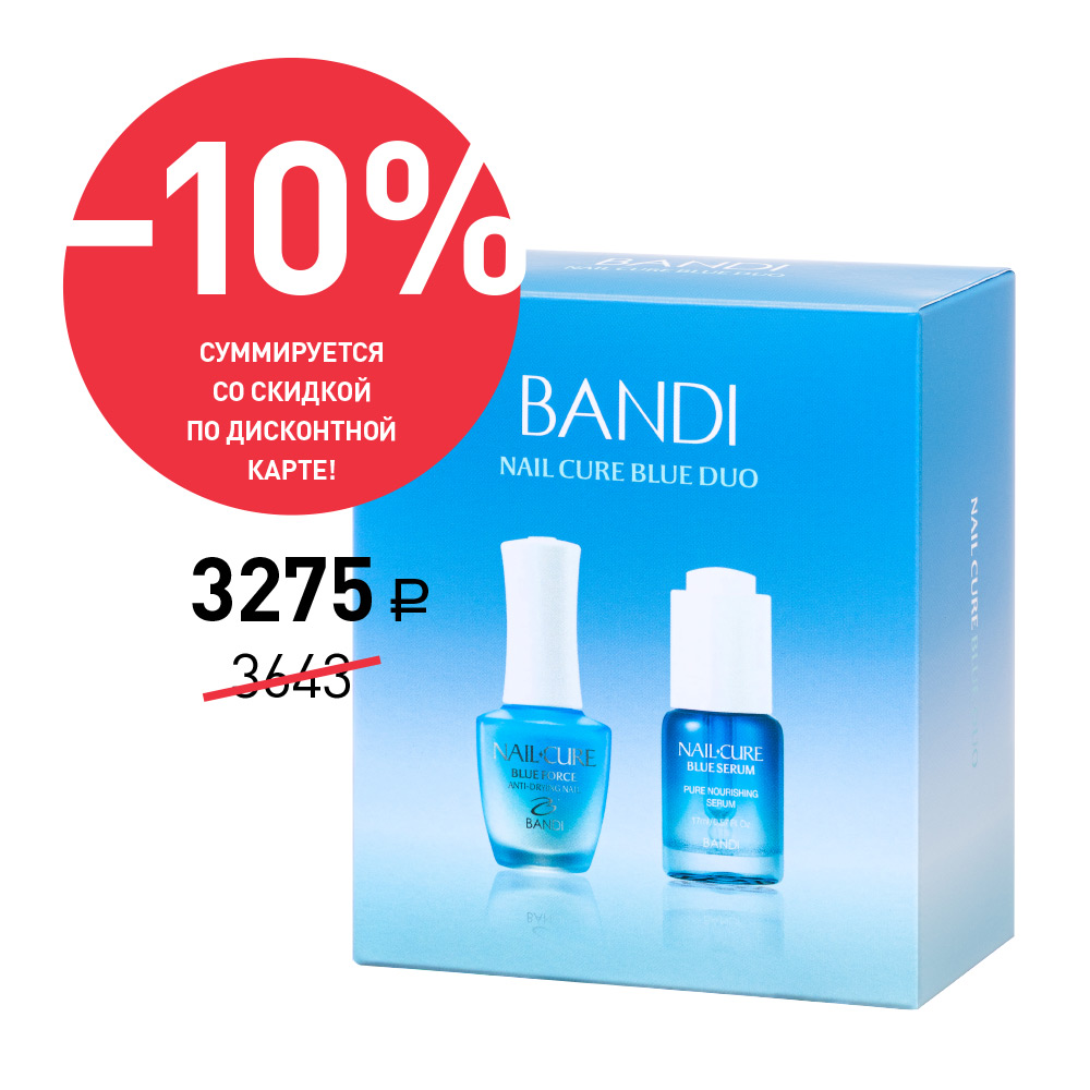 - BANDI Nail Cure Blue Force «Мощь океана» – настоящее спасение для ослабленных и деформированных ногтей. Изготовленное на основе морских водорослей, средство питает и регенерирует поврежденную ногтевую пластину, возвращая ей блеск и здоровье;