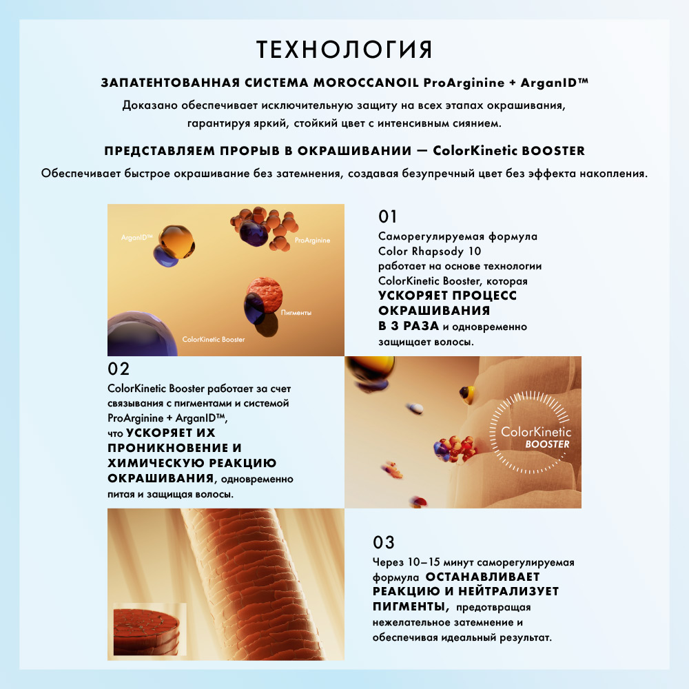 ЗАПАТЕНТОВАННАЯ СИСТЕМА MOROCCANOIL ProArginine + ArganID доказано обеспечивает исключительную защиту на всех этапах окрашивания, гарантируя яркий, стойкий цвет с интенсивным сиянием. Саморегулируемая формула Color Rhapsody 10 работает на основе технологии ColorKinetic Booster, которая УСКОРЯЕТ ПРОЦЕСС ОКРАШИВАНИЯ В 3 РАЗА и одновременно защищает волосы. ColorKinetic Booster работает за счет связывания с пигментами и системой ProArginine + ArganID®️, что УСКОРЯЕТ ИХ ПРОНИКНОВЕНИЕ И ХИМИЧЕСКУЮ РЕАКЦИЮ ОКРАШИВАНИЯ, одновременно питая и защищая волосы. Через 10-15 минут саморегулируемая формула ОСТАНАВЛИВАЕТ РЕАКЦИЮ И НЕЙТРАЛИЗУЕТ ПИГМЕНТЫ, предотвращая нежелательное затемнение и обеспечивая идеальный результат.